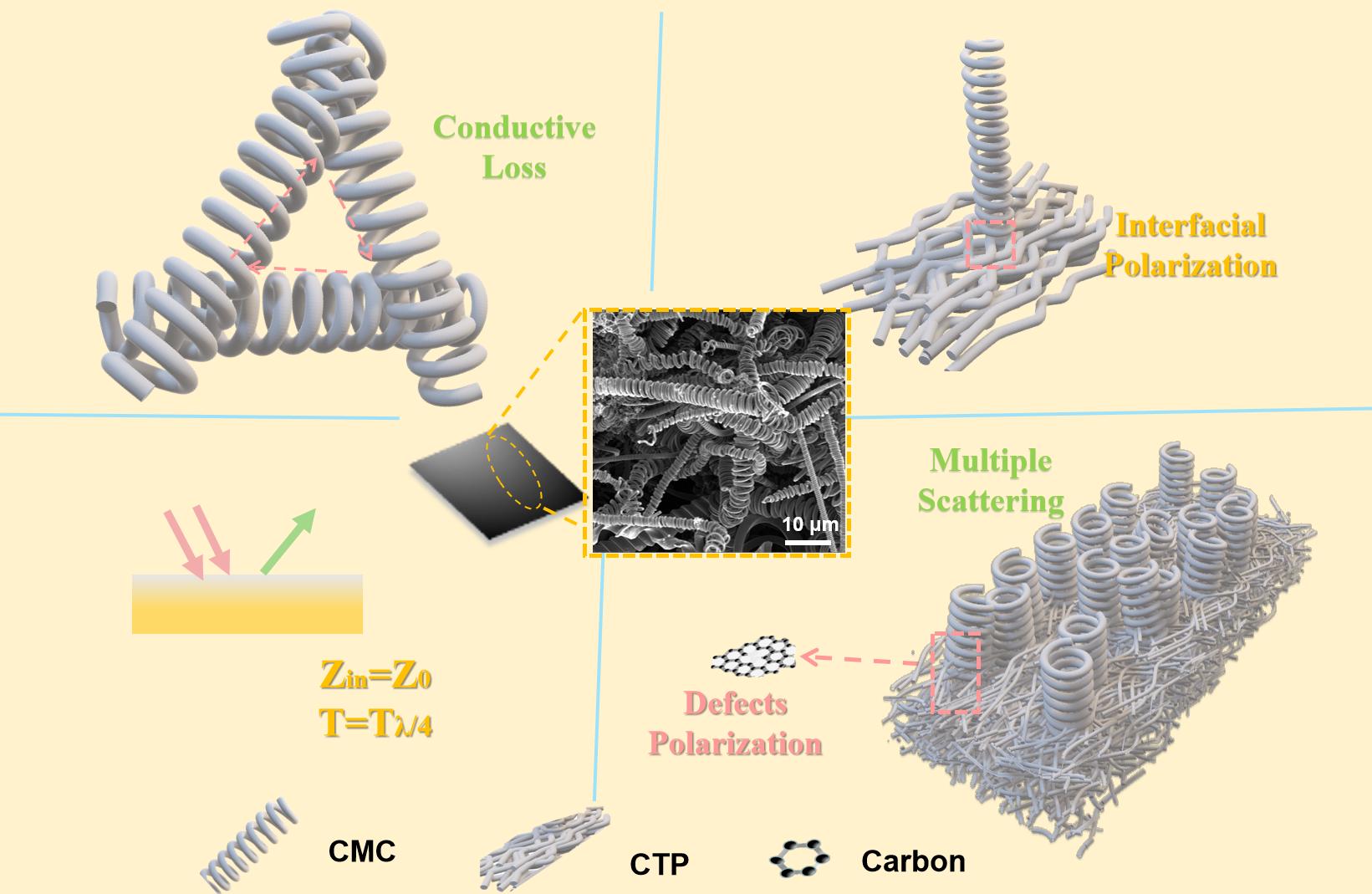 圖6顯示了CTP/CMC的MA機制。CTP具有成本低、重量輕和寬帶吸收的優(yōu)點,同時為CMC的生長提供了天然的基質(zhì)。螺旋CMC的合成同時改善了電導(dǎo)率損失和交叉極化損失。同時,CTP和CMC之間的連接會產(chǎn)生許多極化位點,從而增強界面極化。通過改變Ni催化劑的量,可以調(diào)節(jié)CMC的生長,這也調(diào)節(jié)了CTP/CMC的阻抗。由于其豐富多樣的吸收機制,CTP/CMC-10取得了優(yōu)異的MA性能。