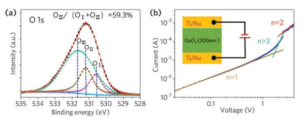 圖2. 濺射非晶GaOx膜的X射線光電光譜光譜和基本電學(xué)特性。(a) XPS O1s核心級(jí)光譜,(b)黑暗環(huán)境下雙對(duì)數(shù)坐標(biāo)的I-V曲線以及與空間電荷限制電流(SCLC)模型的擬合。插圖顯示了測(cè)試結(jié)構(gòu)的橫截面圖。