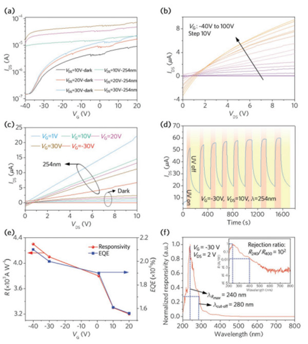 圖3. 非晶態(tài)GaOx薄膜光電晶體管的電氣和光電特性。(a)不同VDS下測(cè)得的IDS-VG傳輸特性。(b) 暗環(huán)境下,IDS-VDS的輸出特性 (c)在不同VG下測(cè)得的IDS-VDS輸出特性。(d)隨時(shí)間變化的光響應(yīng)。(e)在不同的VG下的響應(yīng)度(R)和外部量子效率(EQE)。(f)歸一化的光譜響應(yīng)度。插圖顯示了對(duì)數(shù)標(biāo)度的響應(yīng)光譜。