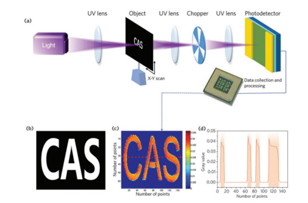圖5. 非晶態(tài)GaOx薄膜光電晶體管的日盲UV成像。(a)使用基于非晶Ga2O3的光電晶體管作為感應(yīng)像素的日盲成像系統(tǒng)的示意圖。(b)在光罩上帶有字母“ CAS”的物體圖像。(c)從日盲成像系統(tǒng)獲得的圖像。(d)沿(c)中標(biāo)記的線的灰度值。