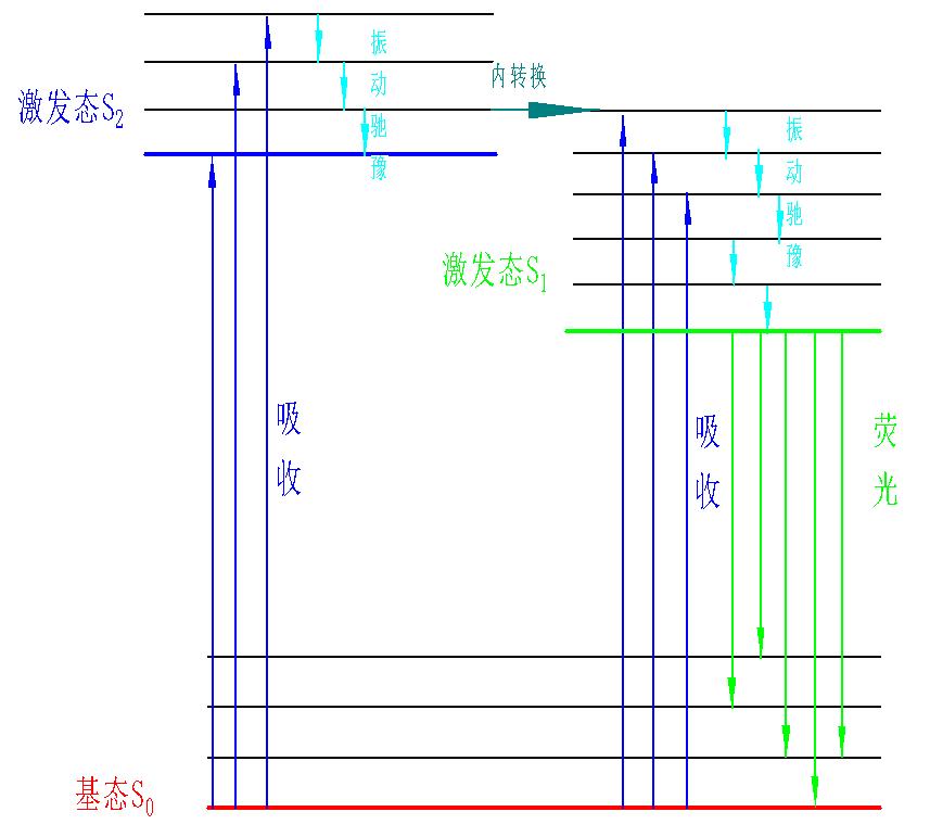 熒光的產(chǎn)生主要是組成發(fā)光材料的分子的能級(jí)輻射躍遷的結(jié)果。組成熒光物質(zhì)的分子的價(jià)電子能級(jí)因?yàn)榉肿拥恼駝?dòng)和旋轉(zhuǎn),又分裂出分子振動(dòng)能級(jí)和分子轉(zhuǎn)動(dòng)能級(jí)。價(jià)電子在被能量較強(qiáng)的光照射后,價(jià)電子吸收光子,被激發(fā)到價(jià)電子激發(fā)態(tài)(S1,S2...Sn),處于激發(fā)態(tài)的分子不穩(wěn)定,通過(guò)非輻射躍遷(振動(dòng)馳豫,內(nèi)轉(zhuǎn)換)以傳熱方式失去部分能量回到第一激發(fā)態(tài)的最低振動(dòng)能級(jí),然后輻射躍遷返回激態(tài)的各個(gè)振動(dòng)能級(jí),并釋放能量小于等于激發(fā)光子能量的熒光。整個(gè)過(guò)程通常在ns級(jí),對(duì)于人眼是一瞬間的完成的,因此熒光在去掉激發(fā)源后,馬上停止發(fā)光。