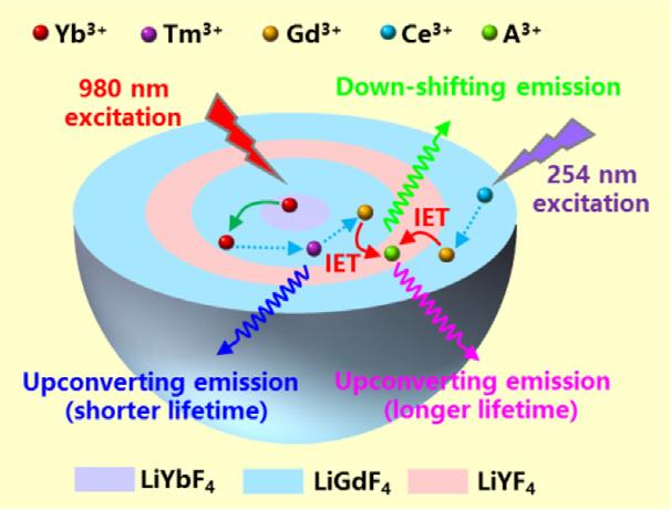 華南理工大學(xué)課題組近日成功合成了LiGdF4為基質(zhì)核殼納米結(jié)構(gòu),該核殼結(jié)構(gòu)中較遠(yuǎn)位置的釓離子Gd+3通過(guò)表面能量轉(zhuǎn)化與摻雜的離子可實(shí)現(xiàn)上轉(zhuǎn)換和下轉(zhuǎn)換熒光發(fā)射。使用980nm和254 nm不可見(jiàn)的雙波長(zhǎng)激發(fā)下,可以實(shí)現(xiàn)單個(gè)納米粒子的三通道可見(jiàn)區(qū)熒光發(fā)射。相關(guān)成果以“Tri-channel photon emission of lanthanides in lithium-sublattice core-shell nanostructures for multiple anti-counterfeiting”為題發(fā)表于Chemical Engineering Journal 397 (2020) 125451。