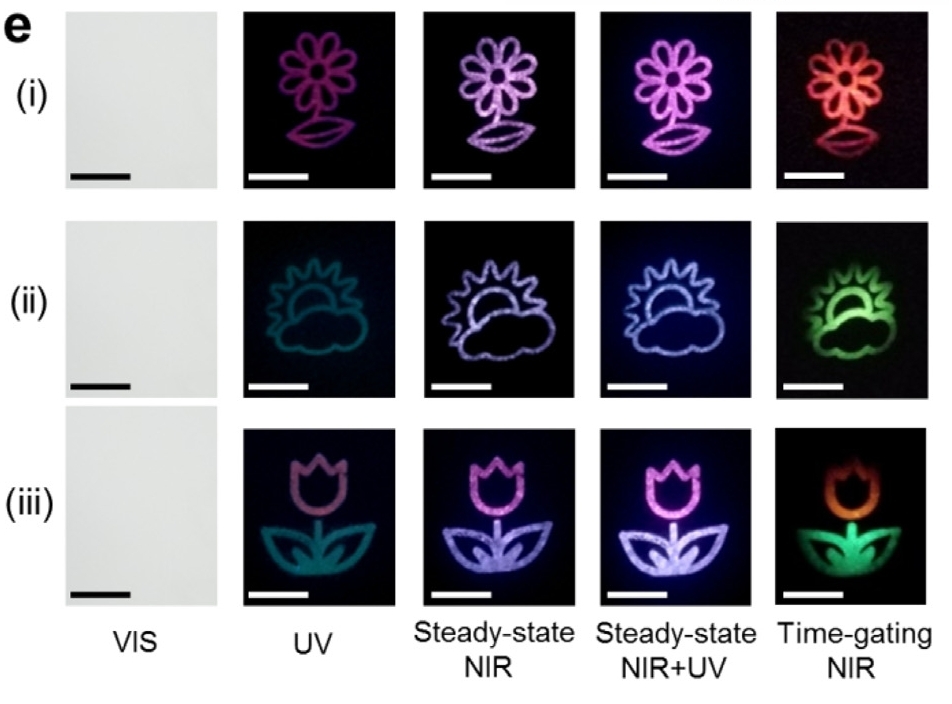 下圖為華南理工大學(xué)課題組將合成材料應(yīng)用到熒光防偽中,(i)(ii)(iii)分別為摻雜不同激活劑的鋰集納米核殼材料。三幅圖案在可見(jiàn)光照射下,在紫外(254nm)照射下,穩(wěn)態(tài)近紅外(980nm)照射下,穩(wěn)態(tài)近紅外(980nm)+紫外(254nm)同時(shí)照射下,和時(shí)間門(mén)控近紅外(980nm)照射下顯現(xiàn)出不同的顏色??梢?jiàn)光照射時(shí)均不能顯現(xiàn),展現(xiàn)其隱形性能,不同照射條件,圖案顯現(xiàn)出明顯的差異,同時(shí)因?yàn)樯限D(zhuǎn)換有著較長(zhǎng)的壽命,且不同輻射能級(jí)的壽命不同,又增加了時(shí)間維度的防偽功能。