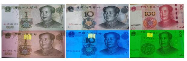 下圖為第五版人民幣在日光燈和紫外燈下的對(duì)比圖片。
