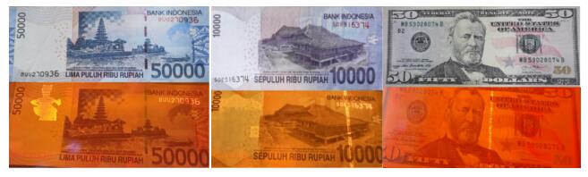 下圖為一些國(guó)外紙幣在日光燈和紫外燈下的對(duì)比圖片。
