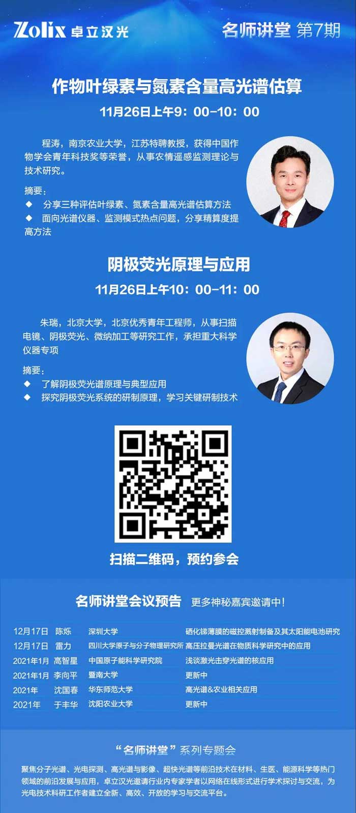 2020年11月26日上午9:00-11:00,卓立漢光邀請(qǐng)兩位專家:南京農(nóng)業(yè)大學(xué)農(nóng)學(xué)院智慧農(nóng)業(yè)系教授程濤老師及北京大學(xué)物理學(xué)院電子顯微鏡實(shí)驗(yàn)室,高級(jí)工程師朱瑞老師為大家做分享,您將有如下課程收獲: