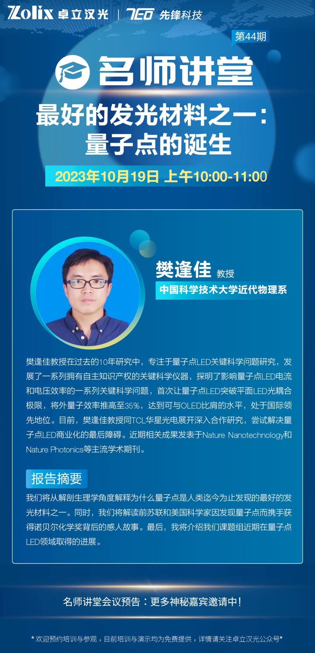 為了繼續(xù)與大家共同感受諾貝爾化學(xué)獎(jiǎng)-量子點(diǎn)的科技魅力,本期卓立漢光特別隆重邀請到了中國科學(xué)技術(shù)大學(xué)近代物理系—樊逢佳教授,再次與大家分享在量子點(diǎn)研究領(lǐng)域的經(jīng)驗(yàn)和心得體會(huì),希望本次講座能夠?yàn)槟目茖W(xué)研究帶來靈感與助力,推動(dòng)研究的進(jìn)展,精彩不容錯(cuò)過,趕快報(bào)名開啟學(xué)習(xí)之旅吧~