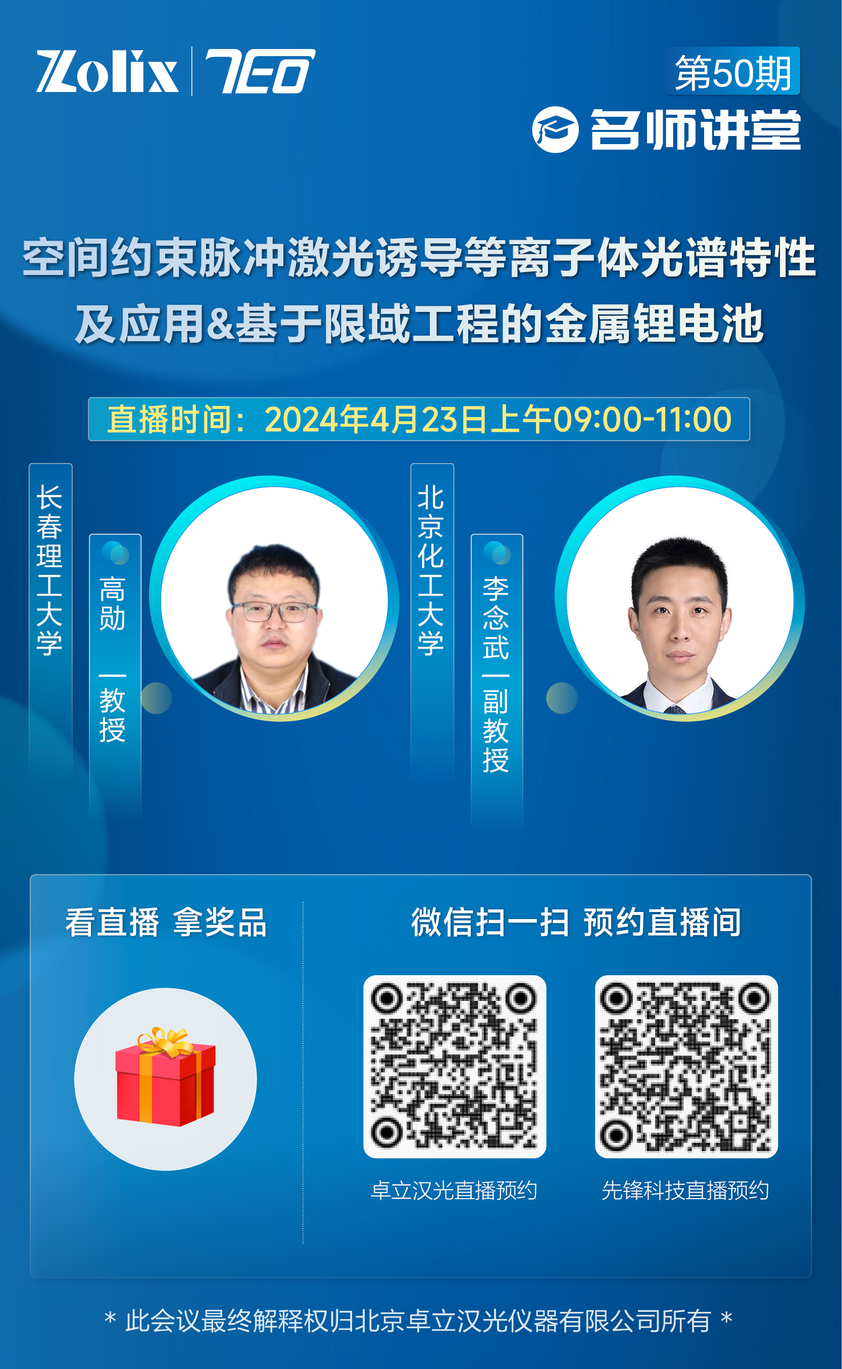 4月23日上午9:00—11:00,長春理工大學(xué)教授—高勛、北京化工大學(xué)副教授—李念武將分別為大家?guī)碇v座《空間約束脈沖激光誘導(dǎo)等離子體光譜特性及應(yīng)用》和《基于限域工程的金屬鋰電池》。直播期間更有豐富好禮相送,歡迎屆時(shí)參加!