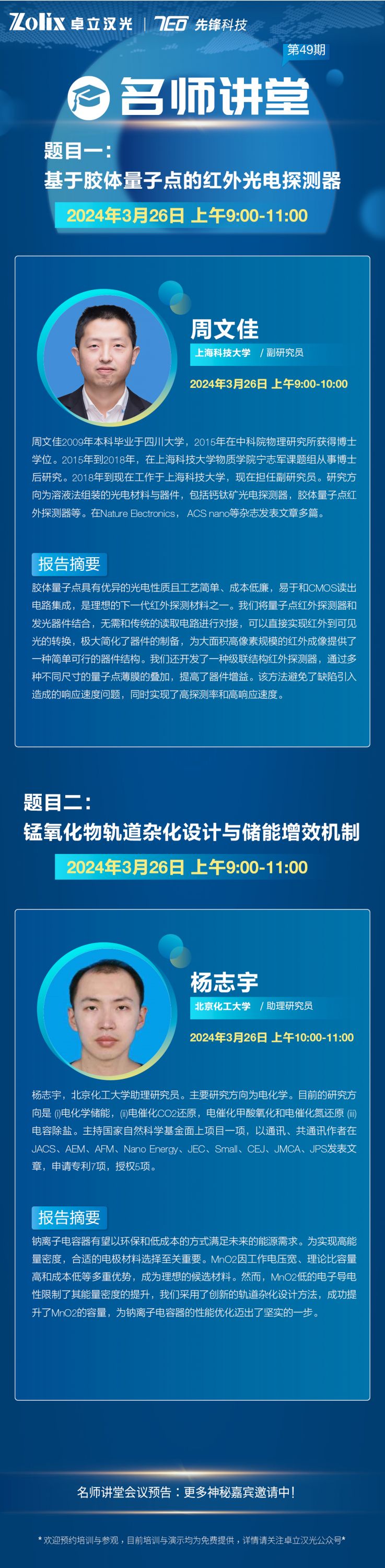 3月26日上午9:00—11:00,上海科技大學副研究員—周文佳、北京化工大學助理研究員—楊志宇將分別為大家?guī)碇v座《基于膠體量子點的紅外光電探測器》和《錳氧化物軌道雜化設計與儲能增效機制》。直播期間更有豐富好禮相送,歡迎屆時參加!