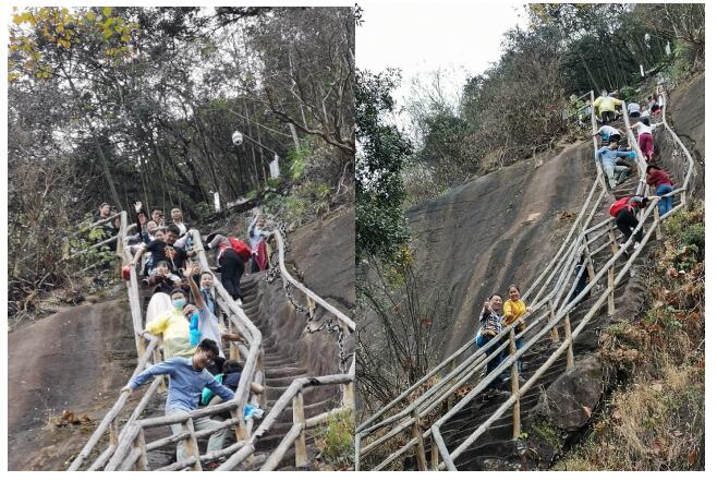 丹霞山精華的部分匯集在這里,從山腳到山頂,一步一景,人文風(fēng)貌與自然觀景相結(jié)合。下著雨,讓原本陡峭的山路更添濕滑,我們手拉手好似拴在一起,一點(diǎn)點(diǎn)往下挪,這就是團(tuán)隊(duì)的力量。