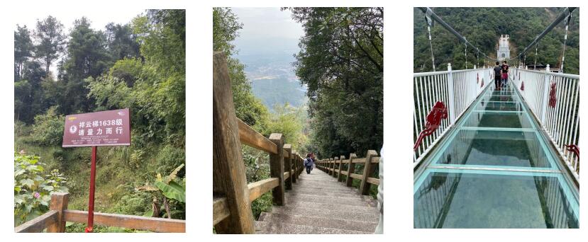 第一天的興奮還未散去,就開(kāi)始了我們第二天的挑戰(zhàn)之旅。這一天我們挑戰(zhàn)了1638級(jí)的祥云梯,來(lái)到祥云梯腳下,只見(jiàn)告示牌上寫(xiě)著“量力而行”四個(gè)字,極目望去,高不見(jiàn)頂,內(nèi)心一陣掙扎,山不在于高,而因?yàn)槎?,我們彼此相望,互相打氣,踏上這幾乎80°的階梯,然而挑戰(zhàn)并沒(méi)有結(jié)束,等待我們的還有一條全透明高空景觀玻璃橋,該橋全長(zhǎng)316米,橋面通體透明,可以非常清楚地看到谷底的景色,如果在谷底仰望,玻璃上的人影也清晰可見(jiàn)。最終,一個(gè)都沒(méi)有少,我們登上了祥云梯,也走向更加驚險(xiǎn)刺激的玻璃橋。