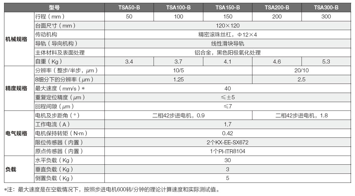 TSAxx-B系列方導軌電動直線滑臺特點:• 工業(yè)級滾珠絲杠(導程4mm),標配二相步進電機,性價比高