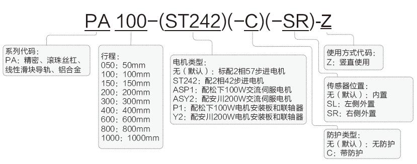 PAxx-Z系列精密電動升降滑臺命名規(guī)則: