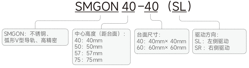SMGON系列高精密直驅(qū)式手動(dòng)擺動(dòng)臺(tái)命名規(guī)則: