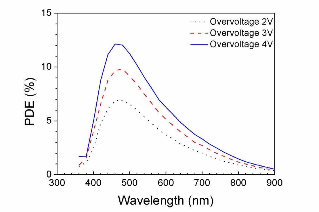 左圖為使用本測試系統(tǒng)測得的某典型SiPM 的PDE 隨波長變化的曲線。圖中黑色點線、紅色虛線、藍色實線分別表示在給SiPM 施加的過偏壓分別為2 伏,3 伏,4 伏時,SiPM 的PDE 隨光波長變化的曲線。從圖中可以看出,該SiPM 的波長響應范圍約為350-900 nm,PDE 的峰值波長約為470nm。隨著過偏壓的升高,PDE 明顯上升,過偏壓為4V 時,峰值PDE 達到約14%,但峰位基本不發(fā)生變化(保持470 nm 不變)。