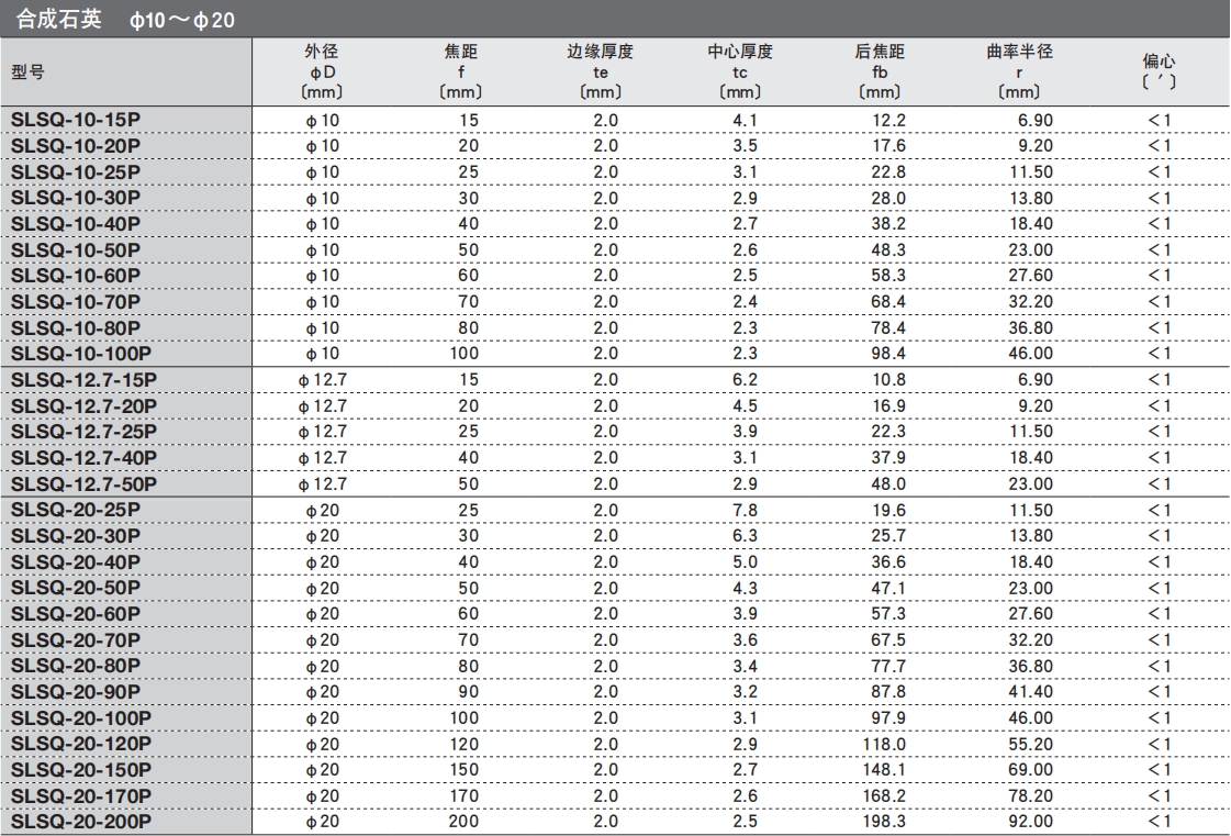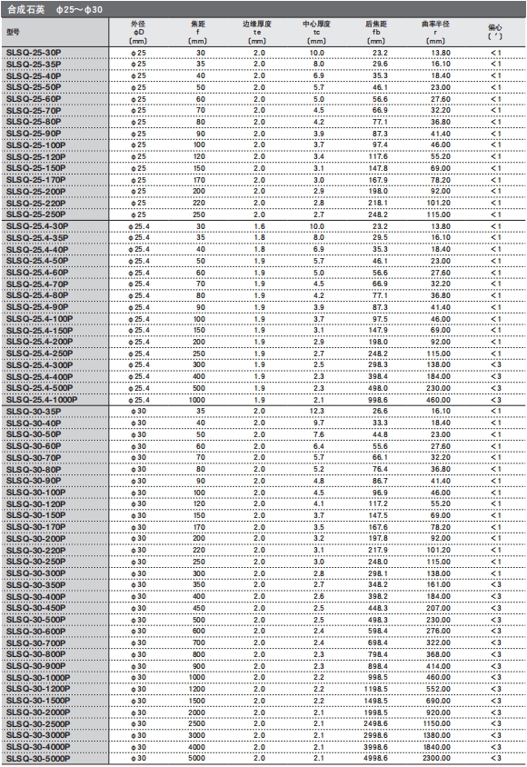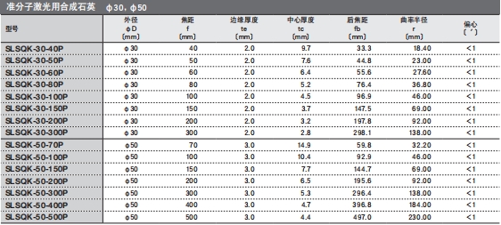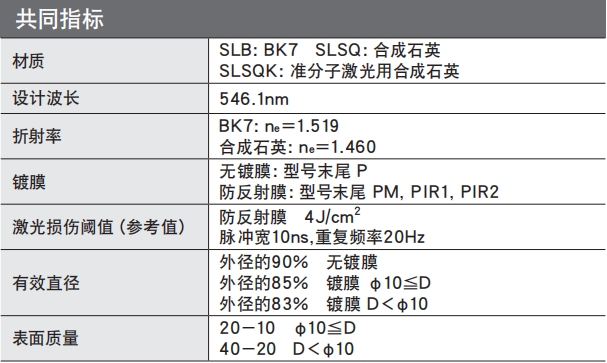 ?有從可見光到近紅外用的BK7材料的透鏡,和可用于350nm以下紫外光的高激光損傷閾值的合成石英透鏡,和適用于ArF(193nm)和KrF(248nm)的準(zhǔn)分子激光用合成石英透鏡,這三種類型。