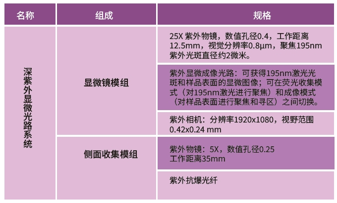 顯微鏡模組配備適配190-600nm的紫外物鏡,可將激光聚焦成約2微米的光斑后激發(fā)樣品熒光或光電流,從而大大提高激發(fā)功率密度,以獲得較強的熒光信號。顯微鏡可在顯微成像和熒光光譜兩種模式下切換,用戶可以通過聚焦到樣品的顯微像確認熒光收集區(qū)域、激光光斑聚焦和收集光路的對準等。