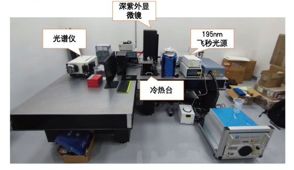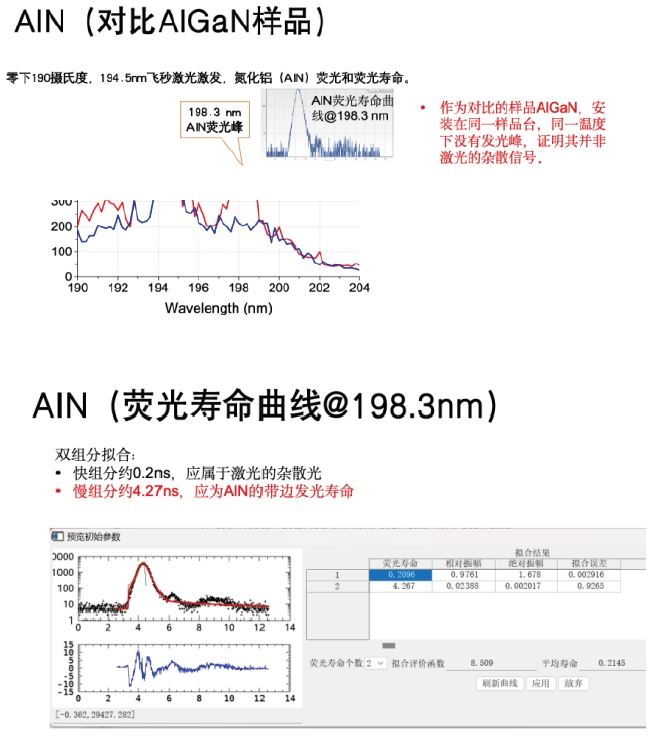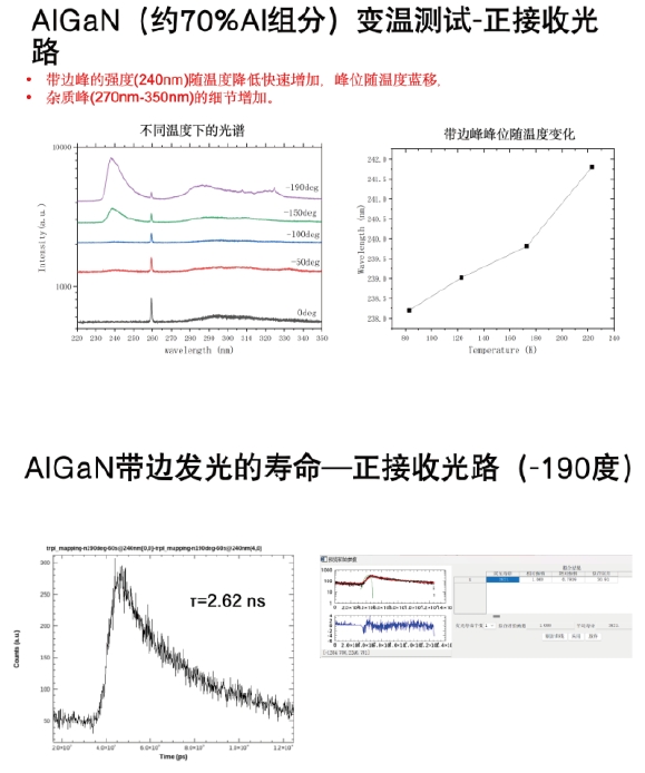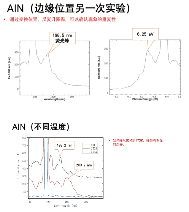 針對AlN的發(fā)光波段(200-210nm),沒有合適的濾光片濾除激光,且AlN由于輕重空穴帶反轉,其熒光發(fā)光角度為側面出光,因此設置側面收集模組,將側面發(fā)出的熒光(200-550nm)通過一個單獨傾斜60度角的物鏡收集后,通過光纖傳入單色儀入口2進行收集和測量。