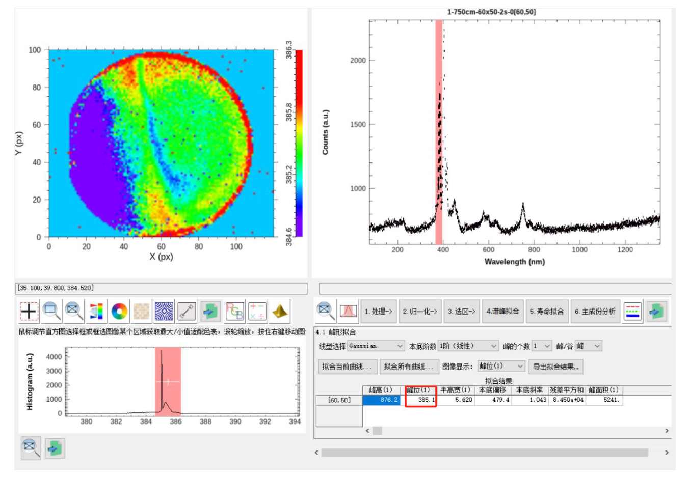 可對(duì)光譜峰位、峰高和半高寬等進(jìn)行擬合。可自動(dòng)擬合并計(jì)算應(yīng)力、晶化率、載流子濃度等信息,樣品數(shù)據(jù)庫(kù)可定制。主成分分析(PCA)和k-均值聚類(lèi)處理模塊。將擬合結(jié)果以二維圖像方式顯示。 |