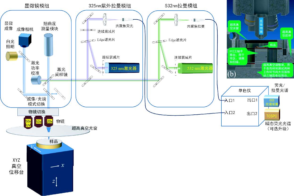 2.光激發(fā)與拉曼光譜收集:激光器通過光線分束器耦合進(jìn)一根光纖跳線中,激光從光纖端面照射到顯微鏡中的分光鏡并通過鏡頭聚焦到樣品的表面,再通過鏡頭收集熒光或拉曼信號回到光纖中,并傳輸?shù)絾紊珒x和光譜CCD中采集拉曼光譜。這種通過鏡頭以共焦方式施加激發(fā)光的方案優(yōu)勢在于:1、通過鏡頭的聚焦,可以更加準(zhǔn)確地控制光斑的大小和位置;2、所有對于激發(fā)光的調(diào)節(jié)機(jī)構(gòu)全部在大氣中,方便調(diào)節(jié),省去了真空中的光纖探針和相應(yīng)的位置調(diào)節(jié)機(jī)構(gòu)。通過這種方式引入單色激發(fā)光的效果詳見第2.3節(jié)
