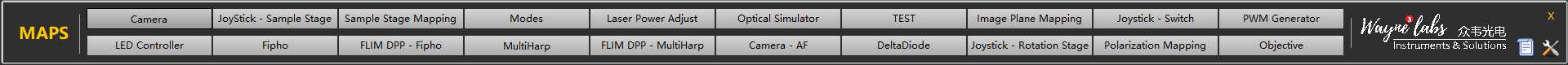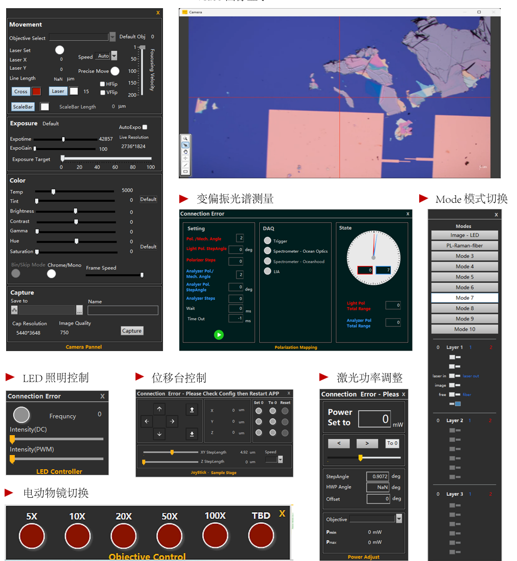 Waynelabs3 軟件匹配多種光源,光路控制及測量系統(tǒng)?;谌妱踊布?ldquo;Mode”一鍵控制模式,輕松實現(xiàn)樣品移動、樣品對焦、激光功率控制、多光路自動切換及校準、偏振控制及多維度高通量掃描測量等功能。