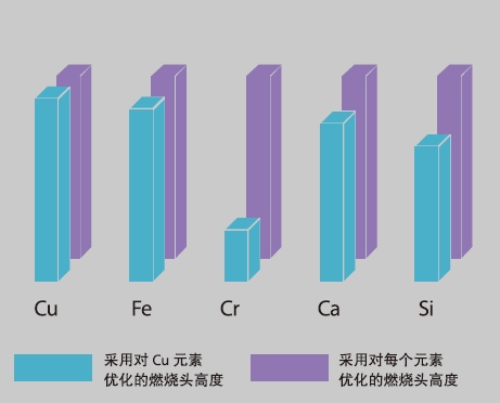 工作頭的位置,作為分析方法的一個參數(shù),與分析方法一起存儲,這樣無需操作人員介入,即可保證多元素火焰分析的每一個元素都能得到*佳的靈敏度。下圖顯示的是對各個元素分別進行燃燒頭高度優(yōu)化得到的靈敏度 ( 紫色 )和只對 Cu 元素進行優(yōu)化得到的靈敏度 ( 青色 ) 對比。