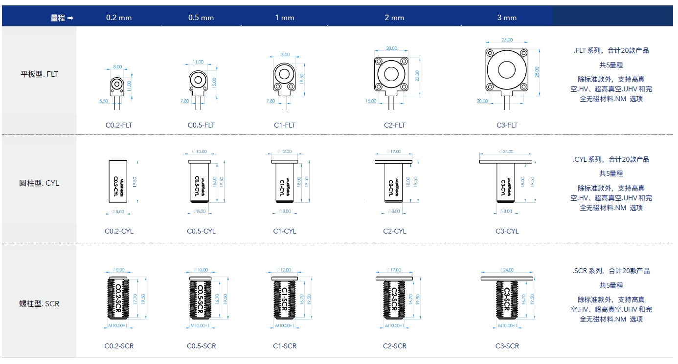 提供平板、圓柱和螺柱三種探頭形式,量程覆蓋范圍 0.2 mm, 0.5 mm, 1mm, 2mm & 3mm,并提供高真空.HV, 超高真空.UHV 和完全無磁材料.NM 的多版本選擇