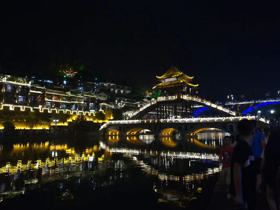 福委會(huì)的小伙伴十分貼心,在安排了兩天緊張的行程后,第三天我們坐車來(lái)到美麗的小城---鳳凰古城, 晚上自由漫步在美麗的沱江邊上,欣賞古城迷人的夜景,古色古香的吊角群樓外加醉人的酒吧,讓小城的風(fēng)景顯得別致而異常美麗?;锇閭?nèi)宄扇旱芈接谛〕堑拿總€(gè)角落,遠(yuǎn)離城市喧囂,放松著每一根神經(jīng)。