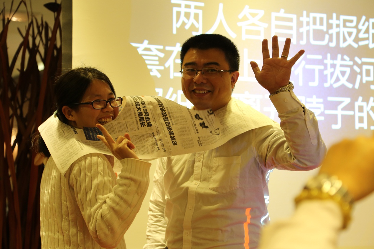 年終總結(jié)大會后,公司集體員工齊聚一堂,歡聲笑語,其樂融融,用餐過程穿插了許多有趣的游戲,其中包括:擠眉弄眼、手舞足蹈、報紙拔河、巧合啤酒、一反常態(tài)等等。大家參與興致濃厚,把用餐氣氛一次次帶入高峰。