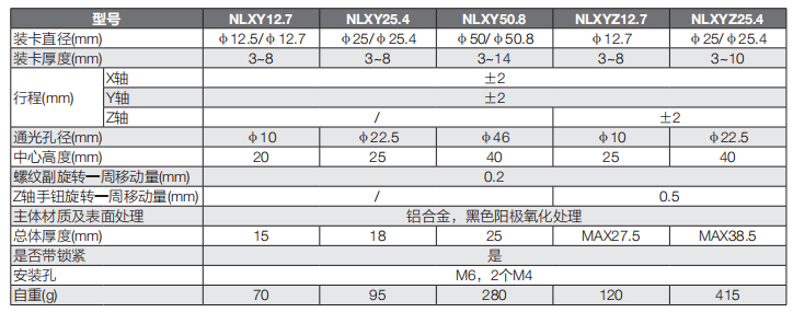 NL系列透鏡調(diào)整架選型表: