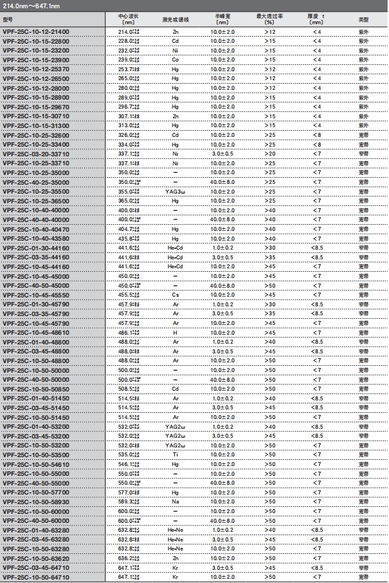 日本SIGMA KOKI窄帶干涉濾光片選型表: