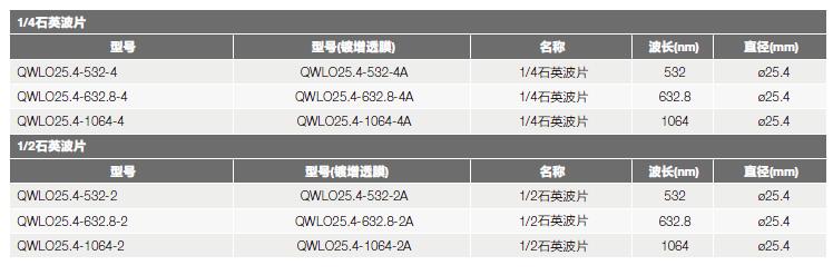 QWLO系列石英多級(jí)波片選型表: