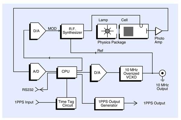 銣鐘又被稱為銣原子鐘,是由銣原子部分和壓控晶體振蕩器組成。銣頻標是一種被動型原子頻率,利用的是基態(tài)超精細能級之間的躍遷,躍遷頻率為6.834,682,612 GHz。原子遷躍對微波信號起鑒頻作用而產(chǎn)生誤差信號,通過鎖相環(huán)路伺服晶振的頻率,使激勵信號頻率鎖定到原子躍遷頻率,實現(xiàn)晶振輸出頻率的高度穩(wěn)定和準確。