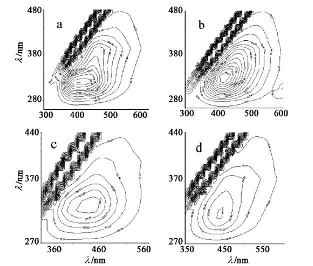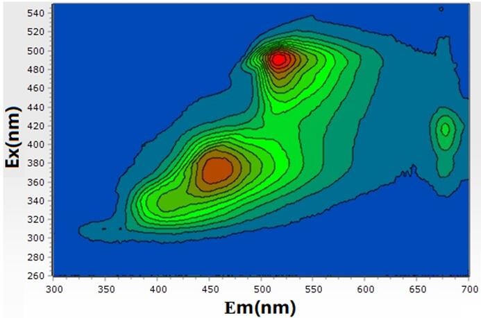 三維熒光光譜(EEMs)是將熒光強度以等高線方式投影在以激發(fā)光波長和發(fā)射光波長為縱橫坐標(biāo)的平面上獲得的譜圖,圖像直觀,所含信息豐富。