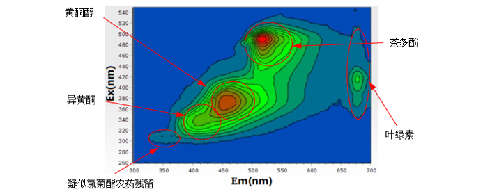 每種茶葉中均含有黃酮醇、茶多酚、葉綠素c、葉綠素a,其含量影響著茶葉的感官品質(zhì),使用三維熒光能快速檢測茶葉中四中物質(zhì)的相對含量,進而通過三維熒光光譜對茶葉進行分級。另外三維熒光譜對茶葉中氯菊酯農(nóng)藥殘留也有較好的檢測效果。