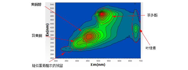 每種茶葉中均含有黃酮醇、茶多酚、葉綠素c、葉綠素a,其含量影響著茶葉的感官品質(zhì),使用三維熒光能快速檢測(cè)茶葉中四中物質(zhì)的相對(duì)含量,進(jìn)而通過(guò)三維熒光光譜對(duì)茶葉進(jìn)行分級(jí)。另外三維熒光譜對(duì)茶葉中氯菊酯農(nóng)藥殘留也有較好的檢測(cè)效果。