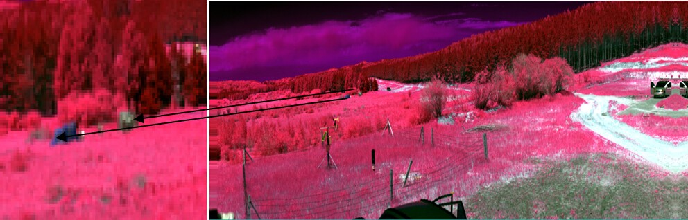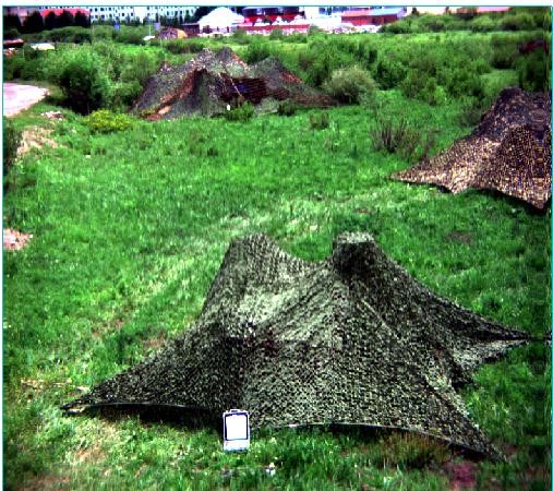 利用短波紅外相機(jī)對(duì)目標(biāo)進(jìn)行拍攝,獲取到相應(yīng)的偽裝目標(biāo)圖像,如下圖所示,光譜范圍為1000nm-2500nm波段。紅圈標(biāo)注目標(biāo)為偽裝網(wǎng)。利用短波紅外波段的相機(jī)可以很直接的獲取到偽裝目標(biāo)的影像并與其它背景目標(biāo)區(qū)分開。