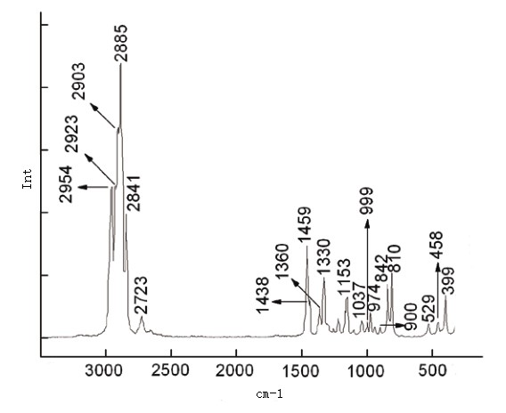 聚丙烯有2954cm-1、2923cm-1、2903cm-1、2885cm-1、2841cm-1、2723cm-1、1459cm-1、1438cm-1、1360cm-1、1330cm-1、1167cm-1、1167cm-1、1147cm-1、973cm-1、842cm-1、810cm-1、529cm-1、456cm-1、399cm-1的特征振動峰。3000-2600cm-1的譜峰多為CH3和CH2中C-H鍵的伸縮振動峰;1500-800cm-1的譜峰多為C-C鍵的伸縮振動和C-H的彎曲振動峰,550-300cm-1的譜峰多為聚丙烯碳鏈骨架的搖擺振動峰[2]。