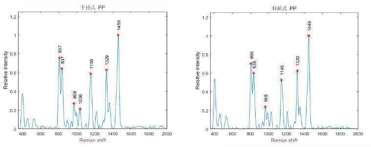 圖2為樣品PP,利用手持式拉曼和實驗室科研拉曼進行對比,譜圖基本一致。