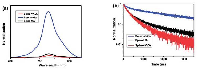 2)載流子重組過(guò)程,即自由電子-空穴發(fā)光是鈣鈦礦太陽(yáng)能電池里常被研究的,也是直接關(guān)乎其性能的過(guò)程[2]。平面異質(zhì)結(jié)鈣鈦礦太陽(yáng)電池除了鈣鈦礦層具有強(qiáng)大的光電性能,還需要電子傳輸層和空穴傳輸層為電子和空穴提供了獨(dú)立的輸運(yùn)通道。組成的結(jié)構(gòu)又分為n-i-p型和p-i-n型兩種,其中鈣鈦礦層分別與電子傳輸層和空穴傳輸層形成兩個(gè)界面, 在這兩個(gè)界面上實(shí)現(xiàn)電子和空穴的快速分離。通過(guò)PL相對(duì)強(qiáng)度(或是量子產(chǎn)率)以及TRPL的衰減時(shí)間變化,可以佐證通過(guò)替換電子傳輸層、空穴傳輸層材料,電子空穴被快速抽取,IPCE得以改良的結(jié)果。用PL和TRPL反饋CH3NH3PbI3與不同材料傳輸層的相互作用[3]
