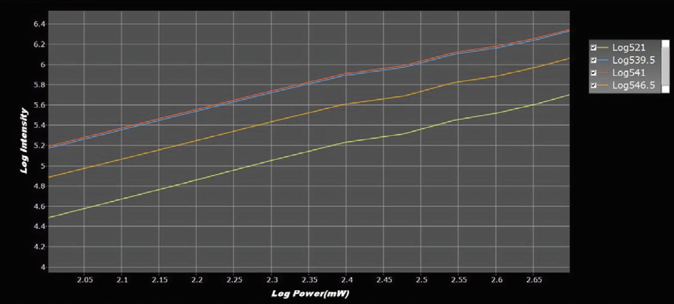 接下來(lái)對(duì)上轉(zhuǎn)換發(fā)光過(guò)程參與吸收的光子數(shù)進(jìn)行進(jìn)一步考察。上轉(zhuǎn)換發(fā)光通常涉及到多個(gè)光子參與的過(guò)程,其吸收光強(qiáng)和激發(fā)光功率之間存在指數(shù)關(guān)系,因此所發(fā)射的可見光強(qiáng)與激發(fā)光功率之間也同樣存在如下關(guān)系:Iuc∝(Ilaser)n, Iuc表示上轉(zhuǎn)換發(fā)光(Up Conversion)的強(qiáng)度,Ilaser表示用于激發(fā)的激光功率,n表示樣品每發(fā)射出一個(gè)光子所需要吸收的光子數(shù)。當(dāng)對(duì)公式兩邊取對(duì)數(shù)的時(shí)候,可以得到log(Iuc) ∝nlog(Ilaser),即在多光子過(guò)程中,上轉(zhuǎn)換發(fā)光的強(qiáng)度和激光功率的雙對(duì)數(shù)圖是直線關(guān)系,通過(guò)求得直線斜率n,即可得到多光子過(guò)程中吸收的的光子數(shù)n。