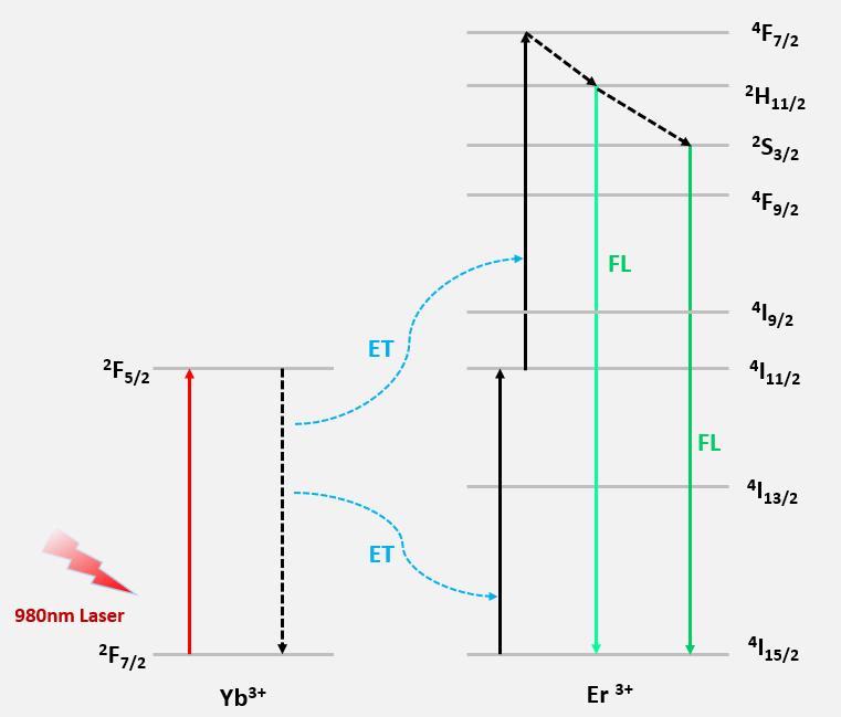 為了分析NaYF4:YbEr的上轉(zhuǎn)換發(fā)光中的多光子吸收過(guò)程,提取NaYF4:YbEr的上轉(zhuǎn)換熒光光譜中位于521.5nm,539.5nm,541nm,546.5nm處的特征峰(圖2),作圖得到發(fā)光強(qiáng)度和激發(fā)功率的雙對(duì)數(shù)曲線。四條曲線的斜率約等于2,表征此樣品在這些波長(zhǎng)為雙光子吸收過(guò)程。具體的過(guò)程為:Yb3+吸收一個(gè)980nm的光子后,從基態(tài)躍遷到激發(fā)態(tài),并將能量傳遞(ET)給Er3+,使之躍遷到激發(fā)態(tài),與此同時(shí)Yb3+回到基態(tài)并繼續(xù)吸收能量,處于激發(fā)態(tài)的Er3+繼續(xù)吸收Yb3+傳遞過(guò)來(lái)的能量發(fā)生更高能級(jí)的躍遷,*后以輻射躍遷的方式回到基態(tài),并釋放出特征綠光(圖3)。