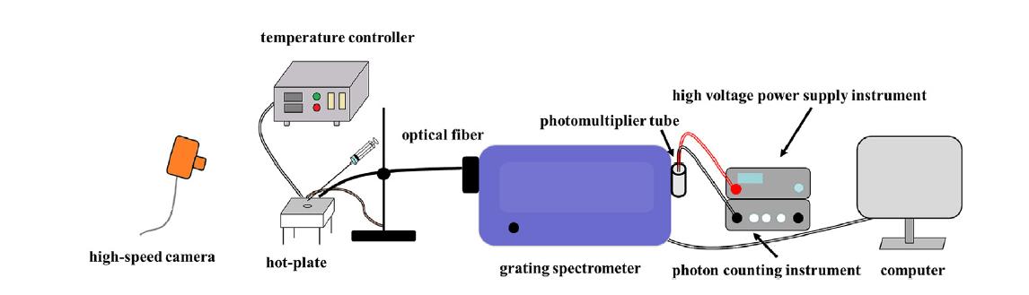 上圖為相關(guān)的實驗簡圖,圖中科學(xué)家將摻有一定比例活化劑的煤油滴到變溫臺上,變溫臺可以從100度到600多度控制,高速相機拍攝液滴在變溫臺上隨溫度變化后的燃燒情況。而在燃燒時火焰發(fā)光通過光纖收集到光譜儀中,再由PMT監(jiān)控發(fā)光波段隨時間變化的衰減過程。整個實驗中,監(jiān)控燃燒產(chǎn)物OH自由基的發(fā)光波段306.5nm,光譜儀將色散位置設(shè)置到該波段,然后用PMT進行監(jiān)控。監(jiān)控過程中PMT高壓設(shè)置為1000V,使其處于光子計數(shù)狀態(tài),然后連接數(shù)采,對OH發(fā)光進行實時監(jiān)控掃描。