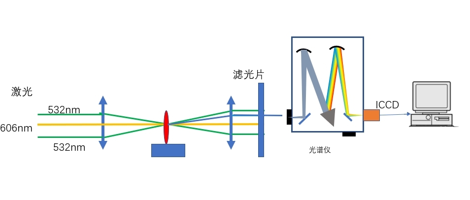 如果將染料激光器引入實驗,在Nd:YAG 激光器后面接上染料激光器,用532nm泵浦我們可獲得多個波段的激發(fā)激光,例如606nm的激光,然后經(jīng)與兩束532nm激光在時域上進行調(diào)整,在滿足CARS的相位匹配條件下,我們可以得到相關(guān)的CARS信號,從而可以用來分析燃燒場的溫度和組分濃度信息。