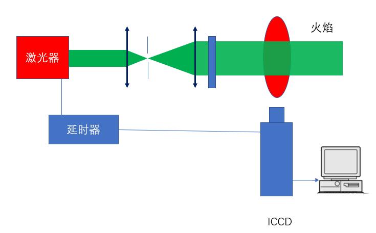 在燃燒過程中,燃燒不充分會產(chǎn)生很多中間產(chǎn)物,我們也可以用激光激發(fā)火焰中這些中間產(chǎn)物獲得熒光來分析,也就是激光誘導(dǎo)熒光(LIF),如果將激光經(jīng)過柱面鏡等光學(xué)元件整形成很薄的一個平行平面光,這是我們稱該實驗為平面激光誘導(dǎo)熒光(PLIF)