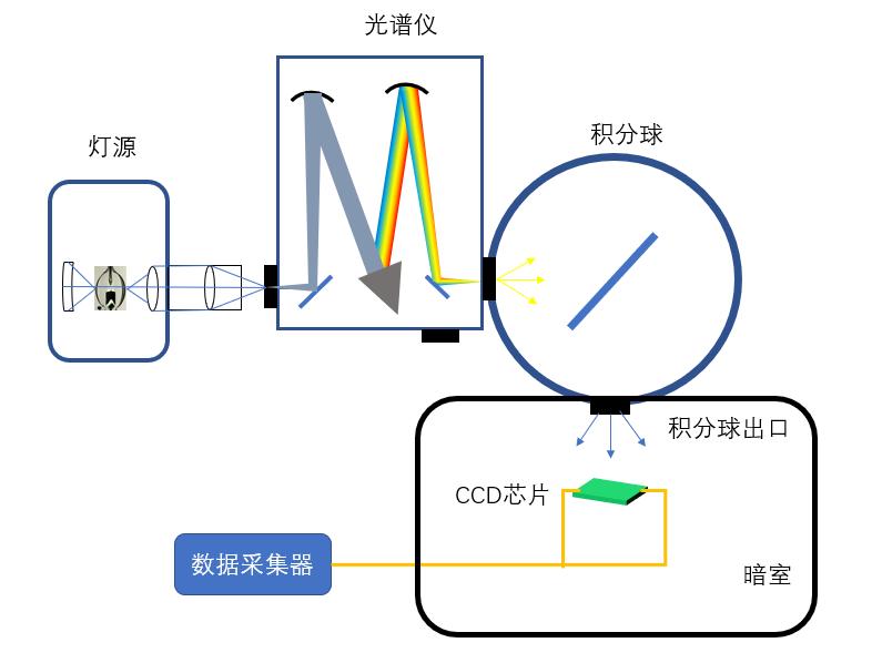 圖1:CCD芯片非均勻性測量流程圖,內(nèi)含TLS(可調(diào)光源)和積分球