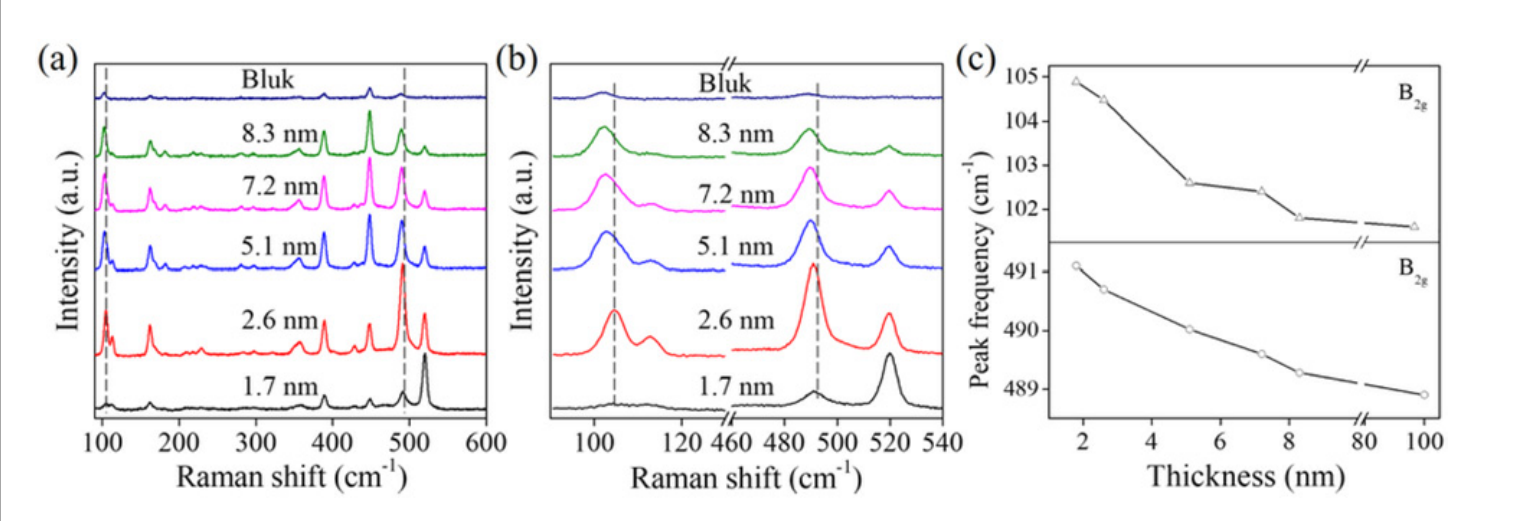 拉曼光譜用于分析PdPS光學性質,如圖4a,b為不同層的拉曼光譜信息,隨著層數(shù)增加,102cm-1和489cm-1的拉曼譜峰發(fā)生紅移。峰位與溫度的依賴性如圖4c所示。