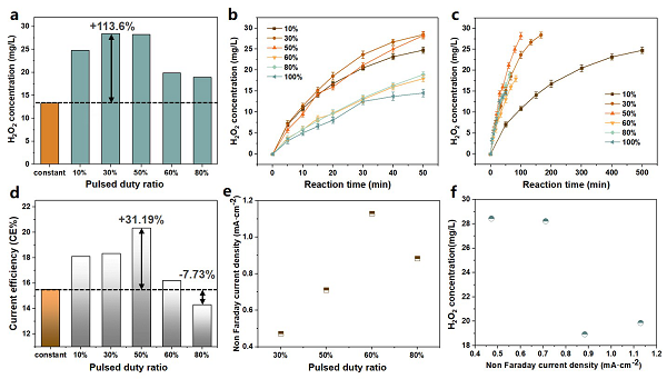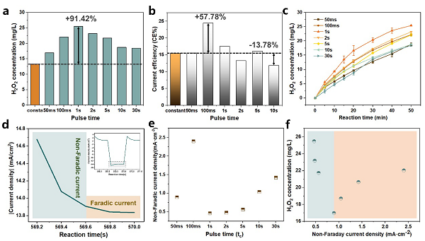 本文提出利用脈沖電催化來實(shí)現(xiàn)2eORR產(chǎn)H2O2中反應(yīng)物吸附、電化學(xué)反應(yīng)和產(chǎn)物擴(kuò)散的協(xié)同和多尺度調(diào)控。通過施加脈沖寬度為1s、占空比為30%、脈沖電壓為-1.0 V v.s. Ag/AgCl的脈沖電位,成功地將H2O2的產(chǎn)量提高了138.12%。此外證實(shí)了脈沖電催化中非法拉第電流密度與H2O2產(chǎn)量之間存在典型的“倒三角”關(guān)系,整體以1.0 mA·cm-2為分界點(diǎn)。DFT計(jì)算結(jié)果則表明,雙電層的放電過程能有效促進(jìn)O2在催化劑表面的吸附并適度調(diào)節(jié)*OOH的吸附能。*后從物質(zhì)擴(kuò)散、EDL充電過程中的電子積聚過程,及EDL放電過程中ORR中間體的吸附三方面提出了脈沖電催化促進(jìn)2eORR產(chǎn)H2O2的機(jī)制。該研究為脈沖電位電催化促進(jìn)H2O2生成的2eORR機(jī)理提供了新的見解,從而為今后電化學(xué)反應(yīng)的精確控制和高效傳導(dǎo)提供指導(dǎo)。