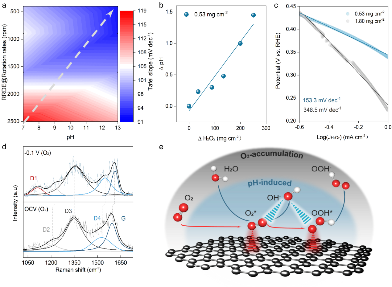 該工作發(fā)現(xiàn)簡(jiǎn)單調(diào)控GDE基底可顯著強(qiáng)化H2O2合成動(dòng)力學(xué)。結(jié)合RRDE,GDE及IME開展了一系列電極動(dòng)力學(xué)、傳質(zhì)擴(kuò)散分析及原位拉曼表征工作,證明了氧氣聚集的界面微環(huán)境提高了三相位點(diǎn)利用率,強(qiáng)化了H2O2合成活性;同時(shí)富氧界面誘導(dǎo)的局域高pH將顯著影響2e-ORR本征動(dòng)力學(xué),穩(wěn)定關(guān)鍵中間體(*O2-)并抑制其質(zhì)子化過程,氧氣擴(kuò)散動(dòng)力學(xué)和局域pH協(xié)同強(qiáng)化了H2O2合成特性。此外,該工作提出的氧氣聚集界面中擴(kuò)散-反應(yīng)耦合效應(yīng)為填補(bǔ)催化劑-電極/反應(yīng)器不同尺度之間的鴻溝提供了新的化學(xué)視角,同時(shí)為其他的涉氣電催化過程(CO2RR,NRR)提供了新思考。