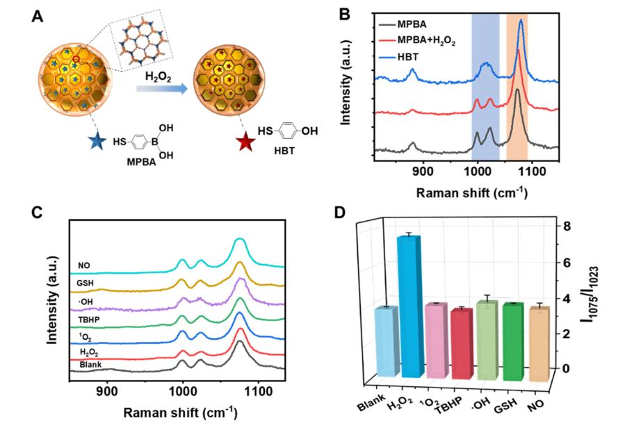 圖2(A)Au@COF/MPBA納米傳感器感應(yīng)機(jī)制。(B) MPBA、MPBA與H2O2和HBT的拉曼光譜。(C) Au@COF/MPBA被不同氧化后的拉曼光譜圖(D) Au@COF/MPBA被不同氧化后的I1075/I1023拉曼峰強(qiáng)度比,Au@COFn濃度為0.5 nM